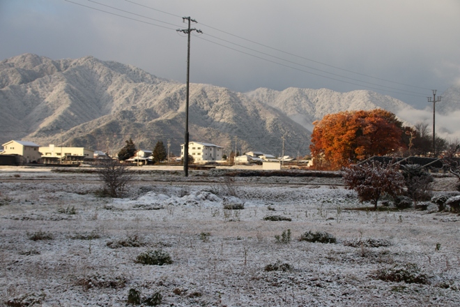 名残りの紅葉も見納めを迎えた大町ですが、一昨日の夜から昨朝にかけては1センチほどの初雪も降って、いよいよ里も冬モードへ突入といった感じです。そして良く晴れ上がって、放射冷却も効いた今朝方は、マイナス4.9℃まで下がり今季一番の冷え込みになりました。ここへきて至って順調に季節も進み、ご近所でも霜に当って柔らかくなった野沢菜を漬けるために、洗っている姿がちらほらと見受けられます。うーんと冷え込んで美味しい野沢菜漬けになれば良いですね。